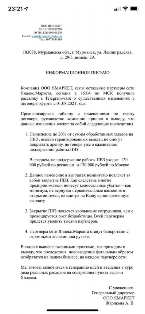 "Данное изменение в выплатах неминуемо повлечет за собой закрытие ПВЗ. Как следствие многие предприниматели понесут колоссальные убытки - как минимум не вернутся первоначальные вложения в открытые точки", - пишет генеральный директор ООО "ЯМАРКЕТ" (Мурманск) Алёна Жарикова в открытом обращении.