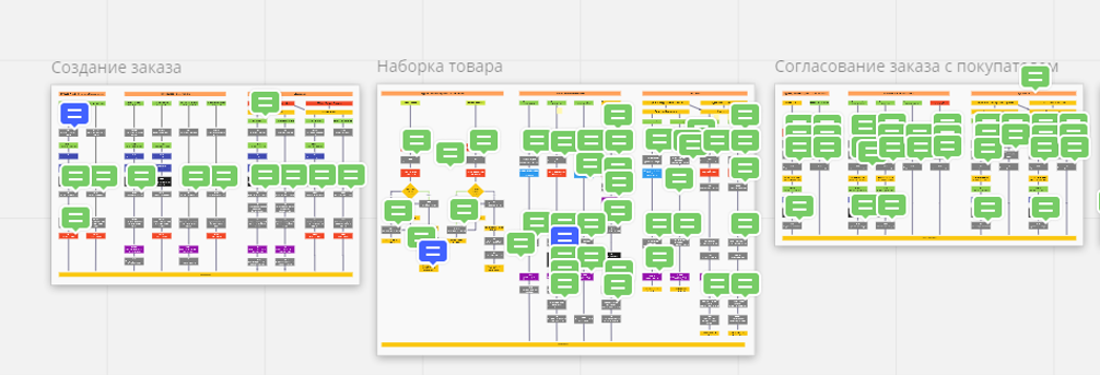 Чтобы зафиксировать, как работают бизнес-процессы по отдельности и как взаимодействуют друг с другом, мы составляли детальные блок-схемы для основных сценариев использования магазина (создание и согласование заказа, сборка и отгрузка товаров, изменение и отмена заказа и т.д.) и фиксировали работу бизнес-процессов по отдельности при этих операциях и во взаимодействии в Miro. Процессов было много.
