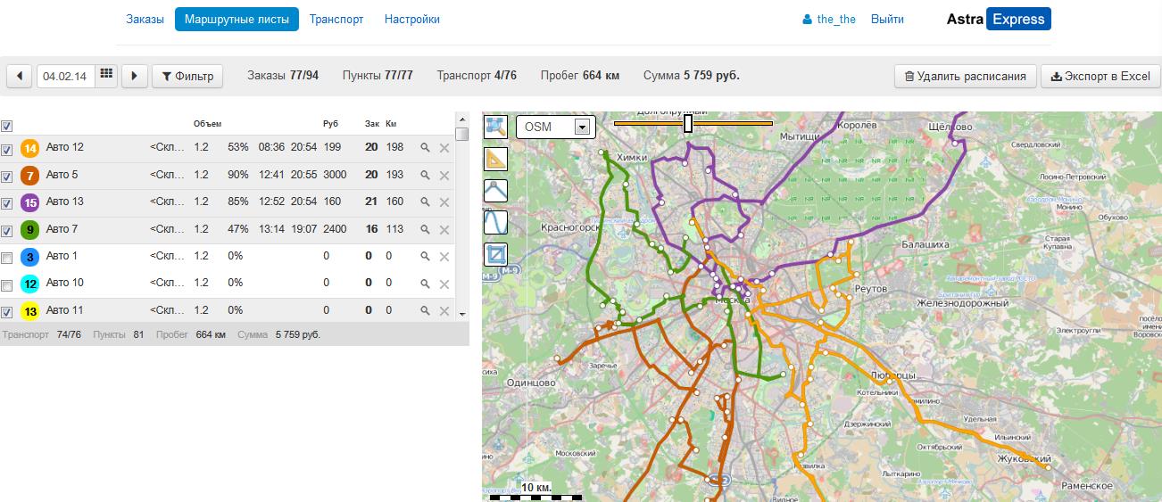 Сейчас Astra Express оптимизирует общий пробег, расписывает транспорт по направлениям, размещает на него заказы и строит план с учетом временных окон и других ограничений. Это одной кнопкой. Но можно потом подвигать окна, подвигать заказы в плане, переносить заказы с одной машины на другую. Сервис будет тут же пересчитывать общий пробег и стоимость доставки, если вы настроили тарифы. Можно даже поиграть с программой, как в шахматы, и попытаться построить более экономичный план. На самом деле, это увлекательное занятие.