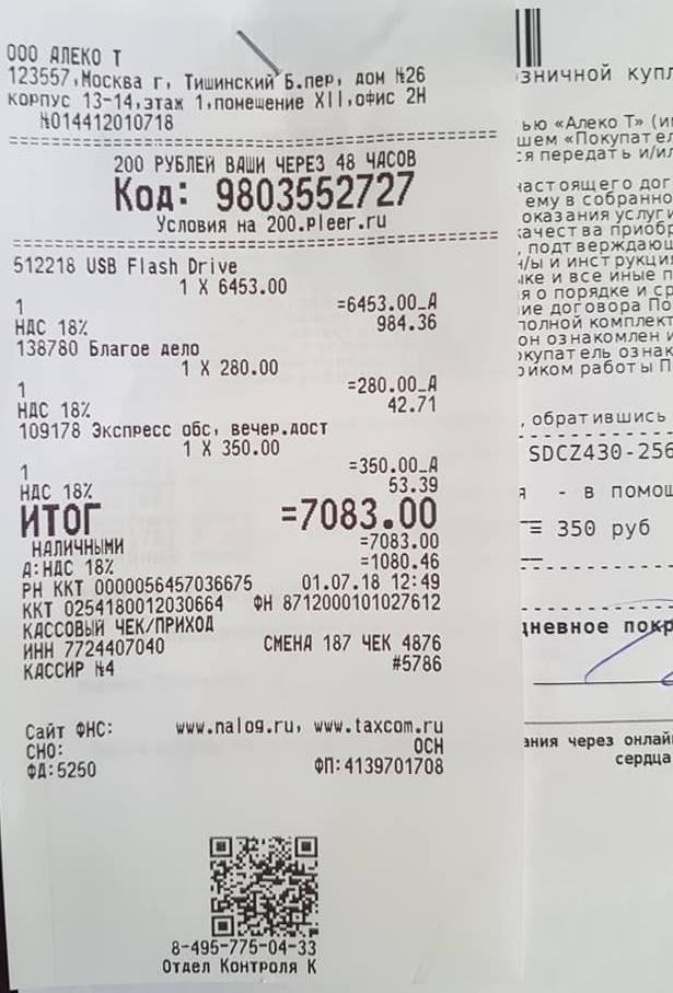 "На картинке свежий чек от туда. Так как он онлайн, то каждый из вас может собственноручно убедиться, что он “левый”. А что это такое вообще за ООО “Алеко Т”, от которого торгует Pleer.ru? Это не случайное ООО, на него даже выписано лицензионное соглашение, позволяющее использовать знак Pleer.ru. Создано ООО “Алеко Т” в 2017 году. Знаете почему? А потому что у Pleer.ru юрлица живут один год, после чего хоронятся", - пишет Алексеев.