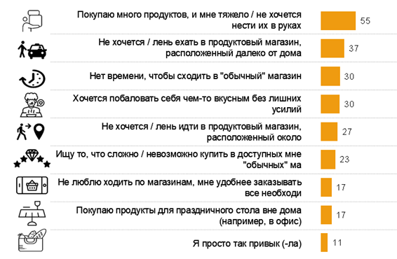 Основными причинами покупок продуктов с доставкой на дом респонденты указали тяжелые покупки, экономию времени и сил, эксклюзивный ассортимент.