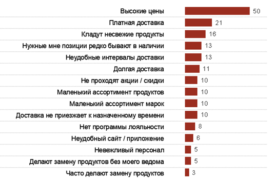 При этом, основными причинами отказа от выбора тех или иных магазинов сервисов доставки продуктов, покупатели традиционно называют высокие цены, платную доставку и несвежие продукты.