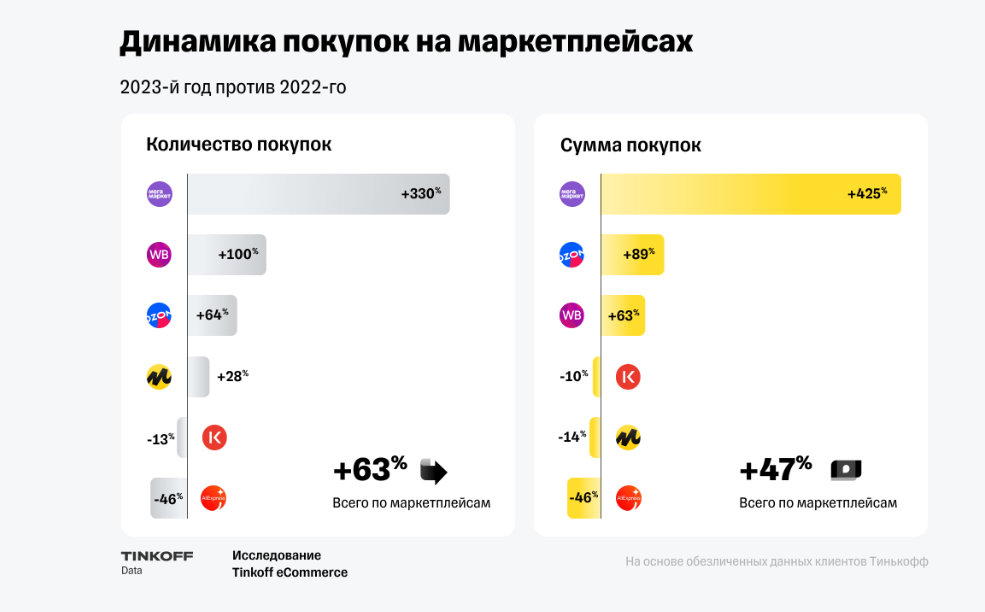 Сегодня маркетплейсы — главная движущая сила российской онлайн-торговли. Объём покупок на них увеличивается каждый год. Согласно исследованию Tinkoff Data, за 2023 год покупатели потратили на маркетплейсах в 1,5 раза больше, чем в 2022 году, а количество транзакций выросло на 63%.