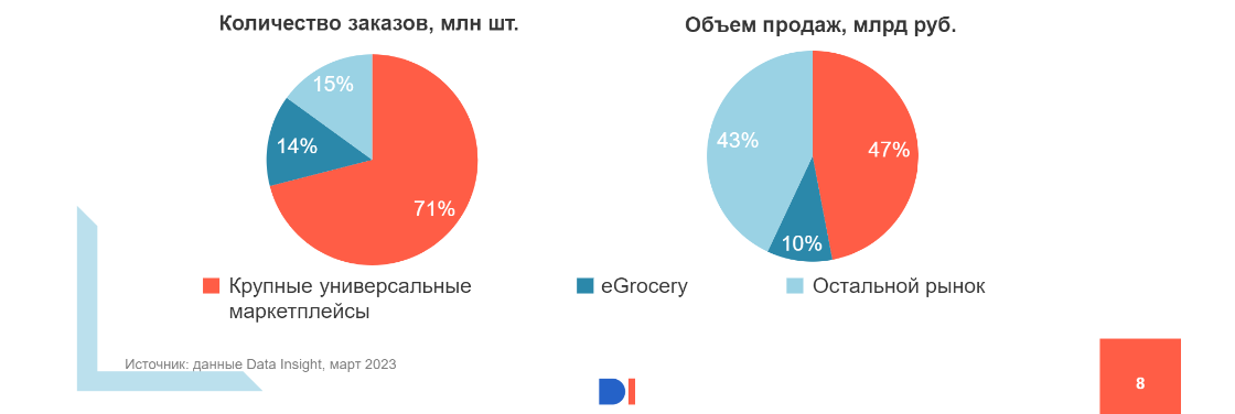 Весь рынок e-commerce растёт за счёт универсальных маркетплейсов. По данным Data Insight, за 2023 год их доля поднялась с трети до почти половины (47%) от общего объёма продаж.