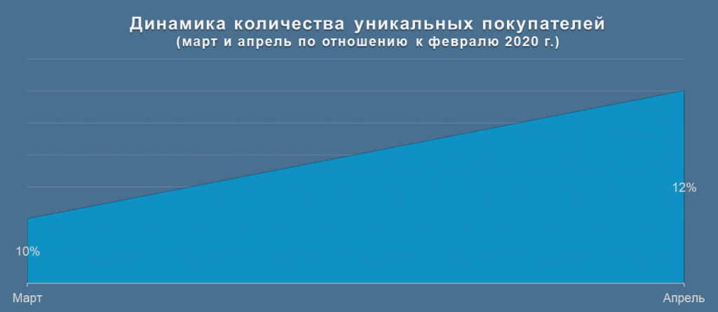 К позитивным моментам, безусловно, можно отнести тот факт, что количество онлайн-покупателей объективно увеличилось, хотя и не в разы. Число уникальных покупателей (тех, кто хотя бы один раз за месяц сделал заказ хотя бы в одном интернет-магазине) выросло в марте на 10%, в апреле на 12% (по сравнению с февралем).