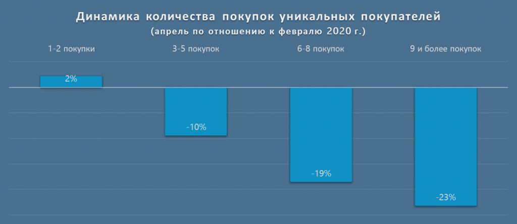 Однако количество покупок, которые были сделаны уникальными покупателями в апреле, выросло в сравнении с февралем на 2% только среди тех, кто сделал одну-две покупки за месяц, а дальше наблюдается резкий спад: количество покупок от 3 до 5 уменьшилось на 10%, от 6 до 8 - на 19%, от 9 и более - на 23%. Иными словами, те, кто в феврале делали покупки примерно раз в неделю и чаще, в апреле стали покупать существенно реже.