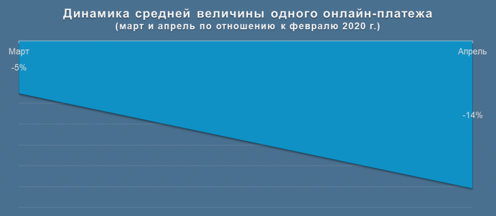 Средняя величина одного онлайн-платежа также сократилась в марте и апреле по сравнению с февралем - на 5% и 14% соответственно. Впрочем, отметим, что эти цифры - "среднее по больнице", и в некоторых отраслях средний чек вырос в марте и апреле по сравнению с февралем. В частности, это касается товаров для детей, цифровых товаров, оплаты услуг связи, интернета и телевидения, доставки готовых блюд и покупок в онлайн-гипермаркетах.