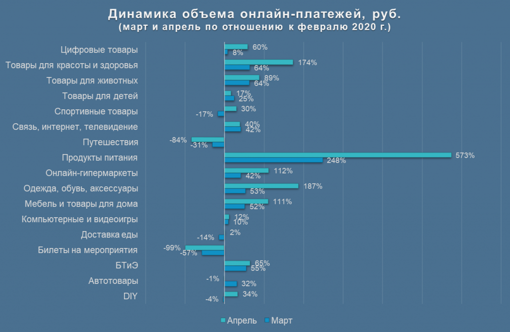 Доставка продуктов питания, разумеется, "взлетела" выше всех: объем платежей вырос в рублях в 3,5 раза в марте и в 6,7 раза в апреле по отношению к февралю. В сегменте продаж одежды, обуви и аксессуаров - рост в 1,5 раза в марте и в 2,9 раза в апреле. В большинстве выросших отраслей заметный рост произошел именно в апреле, когда все сидели дома: в товарах для красоты и здоровья - в 2,7 раза, в онлайн-гипермаркетах, мебели и товарах для дома - в 2,1 раза, в товарах для животных - в 1,9 раза, в БТиЭ - в 1,7 раза, в цифровых товарах - в 1,6 раза.
