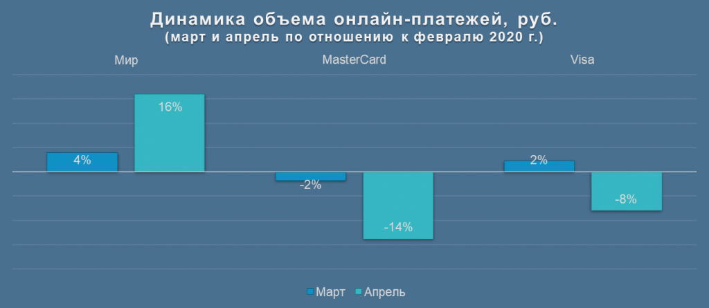 Любопытно, что общий объем платежей, совершенных по картам Visa и MasterCard в апреле, упал на 8% и 14% соответственно, а по картам Мир вырос на 16% в рублях по отношению к февралю. Возможно, это связано с тем, что гарантированное сохранение зарплат в период самоизоляции коснулось, главным образом, бюджетников (основных держателей карт Мир), тогда как остальная часть населения оказалась менее платежеспособной.