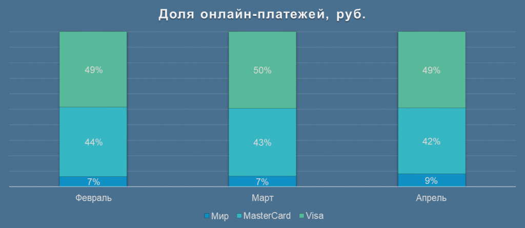 Такое положение отразилось, естественно, и на распределении долей, занимаемых в общем объеме онлайн-платежей картами разных платежных систем. В апреле доля платежей по картам Мир выросла на 2 п.п. по отношению к предыдущим месяцам и составила 9% в рублях.