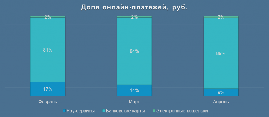 Способы, которыми покупатель предпочитает расплачиваться в онлайне, под влиянием самоизоляции и притока новых (возможно, неискушенных) пользователей, претерпели легкий откат к традиционности. Так, доля расчетов банковскими картами в апреле составила 89% (в марте - 84%, в феврале - 81%), а доля оплат с использованием pay-сервисов снизилась с 17% в феврале до 9% в апреле.