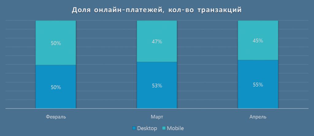 Сидя дома, удобнее делать покупки и оплачивать их с компьютера или ноутбука - так, вероятно, решили пользователи, благодаря которым относительное количество платежей с десктопа выросло в марте и апреле по отношению к февралю и достигло 55% от общего числа онлайн-платежей в апреле. И если в феврале с десктопа и мобильных платили поровну (50/50), то в апреле мобильные платежи уступили 5 п.п., и их доля составила 45% от общего числа транзакций.