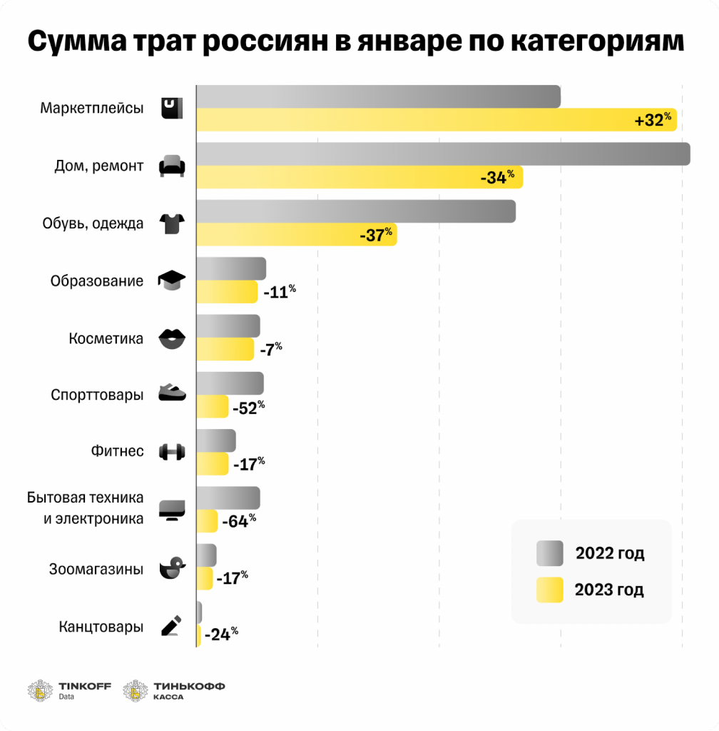 Единственная категория, в которой россияне увеличили траты в январе по сравнению с прошлым годом, - это маркетплейсы. Год к году расходы россиян на электронных площадках выросли на треть. Это может быть связано с закрытием магазинов зарубежных брендов, в результате чего россияне стали чаще искать товары на маркетплейсах.