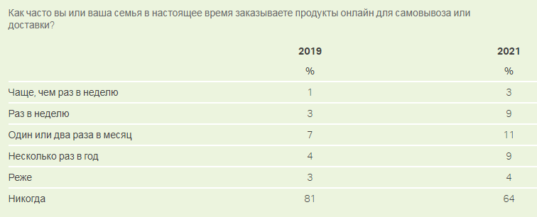 13% респондентов покупают продукты в интернете несколько раз в год (9%) или реже (4%). Несмотря на рост использования этого метода для покупок, он далеко не универсален, поскольку 64% взрослого населения США по-прежнему говорят, что никогда не делают этого.