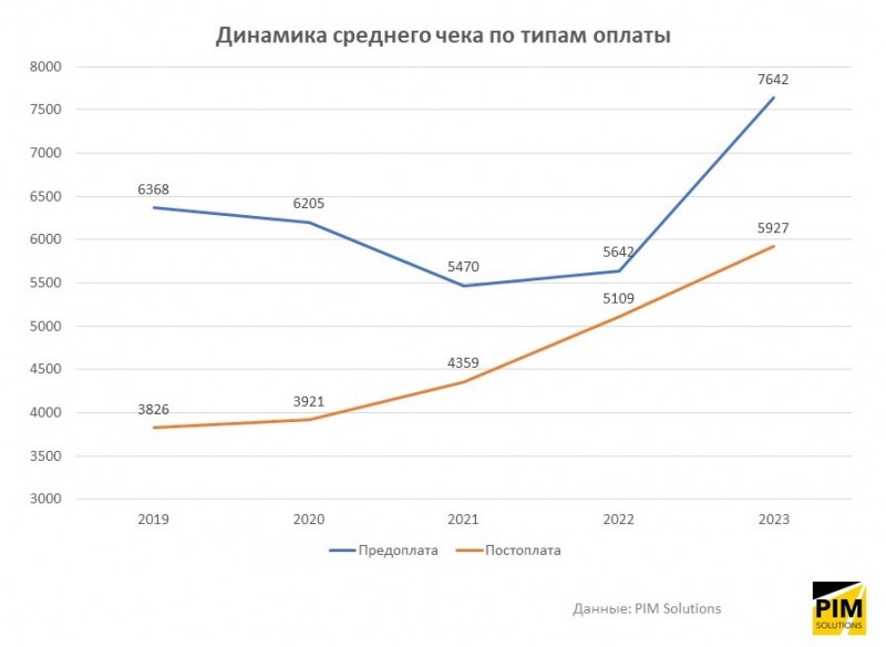 Стоит отметить, что общий средний чек по предоплаченным заказам все еще выше. Однако разница постепенно сокращается. В 2023 году рост среднего чека по предоплате был более значительным, чем по постоплате, но доля предоплаченных заказов продолжает уверенно падать.