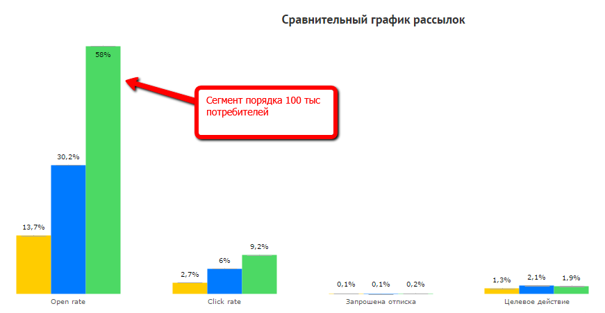 На графике сравнение трех рассылок – массовой и 2 разные сегментации. После использования нескольких десятков разных сегментов удалось найти самый эффективный и поднять показатели относительно изначальной рассылки в 4,5 раза. При этом сегмент большой – порядка сотни тысяч покупателей.