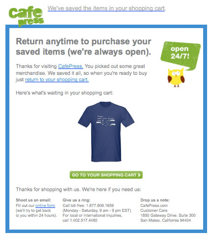 Если вы успели получить адрес электронной почты в первых шагах оформления заказа, вы можете напомнить вашему посетителю о брошенной им корзине. Проявлять излишнюю настойчивость при этом не стоит - предложение купона на скидку будет являться лучшим стимулом для возвращения, нежели строгое указание вернуться и купить.