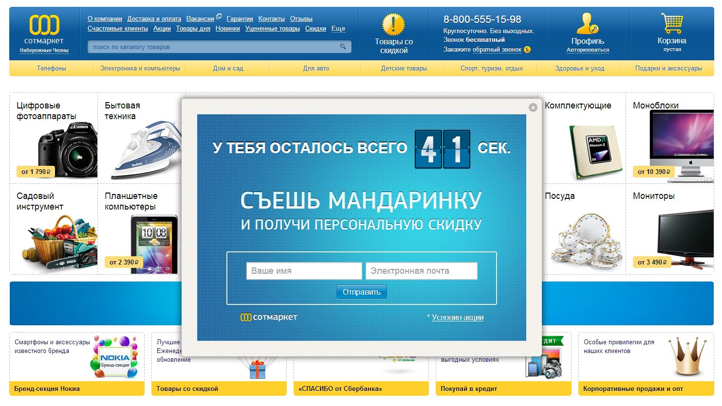 Сотмаркет, помимо прямой мотивации подписаться на их рассылку, стимулирует посетителя сделать это без раздумий как можно быстрее, т.к... счетчик тикает :)