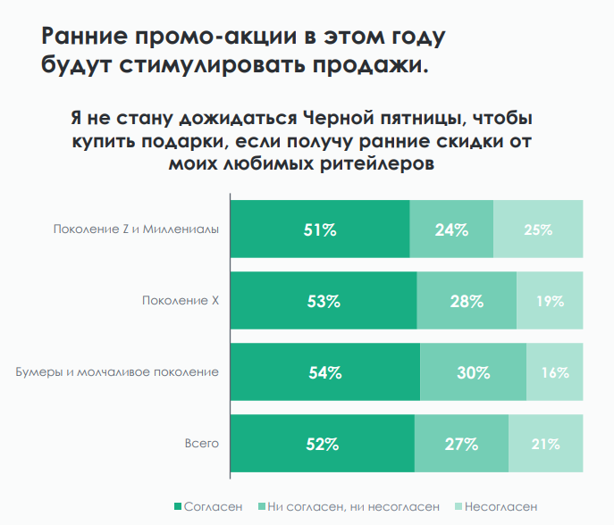 Четверть жителей России собираются больше покупать в онлайне. При этом, напоминают эксперты, каждый второй онлайн-покупатель сейчас чувствителен к стоимости покупки, рассчитывает на бесплатную доставку и низкие цены. Как обычно, основной движущей силой являются акции и распродажи. Потребители готовы совершать ранние покупки: половина респондентов не будет ждать Черной Пятницы и приобретет желаемое в любимом магазине раньше, если получит скидку именно там.