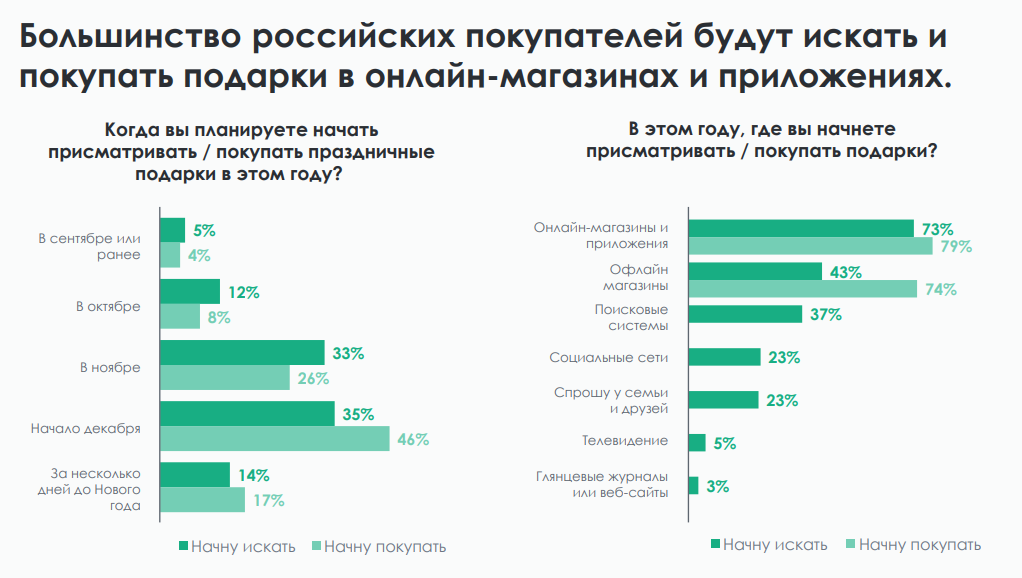 По данным исследования Criteo, в этом году онлайн с небольшим отрывом станет лидирующим каналом для поиска и покупки подарков к зимним праздникам. В ходе опроса об этом сказали 73% и 79% россиян соответственно. Чуть меньшее количество респондентов (74%) планирует выбирать подарки в оффлайн магазинах. Основной пик активности придется на ноябрь и начало декабря. Несмотря на финансовые трудности, практически 60% россиян планируют или точно будут делать покупки в предпраздничном сезоне.