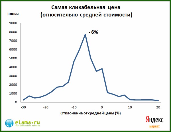 Проведенные исследования показали, что при выборе на карточке товара в Яндекс.Маркете покупатели не обращают внимания на порядок магазина в списке и при выборе руководствуются ценой. Больше всего переходов приходится на предложения с ценой ниже среднего. Самая кликабельная цена – цена меньше средней на 6% (по данным Яндекс.Маркета).