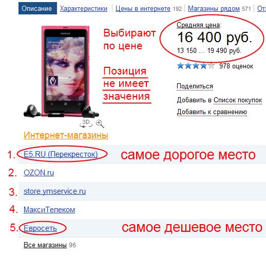 Ввиду аукционного принципа на Яндекс.Маркете, стоимость попадания на первую позицию в списке магазинов на карточке товара в среднем в 7 раз дороже, чем стоимость пятой позиции (по исследованию eLama.ru).