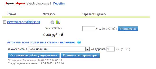 Для использования автоматического управления ставками для Яндекс.Маркета через eLama.ru рекламодатель может загрузить свой YML-файл в систему и указать максимальную стоимость, которую он готов платить за переход целевого посетителя. После этого все заботы по управлению ставками еЛама возьмет на себя. Сервис будет автоматически проверять ставки конкурентов на Яндекс.Маркете и оптимизировать ставку рекламодателя так, чтобы магазин оставался на 5-той позиции по минимальной цене перехода. Также можно выбрать любую позицию на карточке и автоматически удерживать товар на ней.