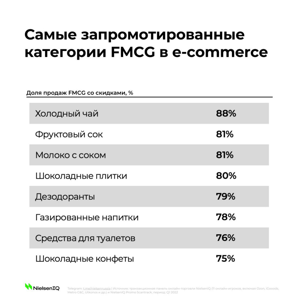 В топе самых запромотированных категорий в онлайн-канале — холодный чай, фруктовый сок, молоко с соком и шоколадные плитки, где доля продаж со скидками свыше 80%.
