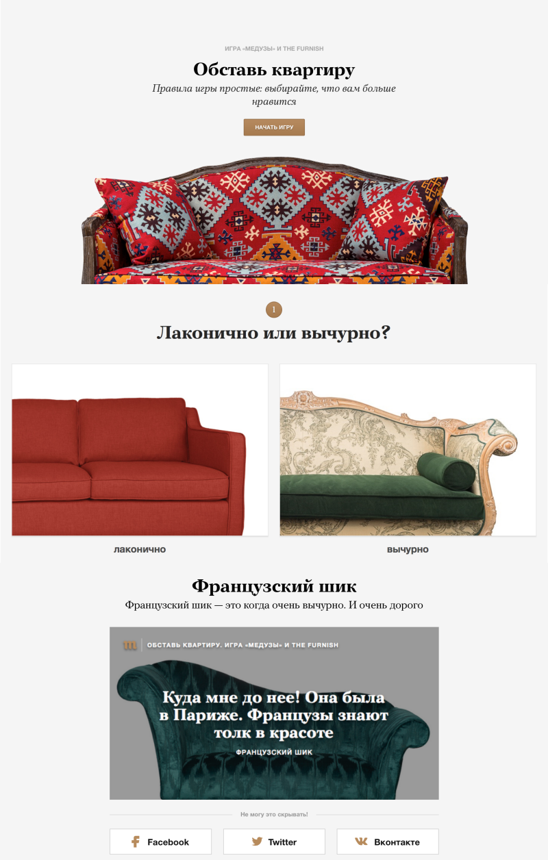 – Мы с «Медузой» запустили совместную игру «Обставь квартиру». Специальный проект позволяет выбрать для жилья красивую дизайнерскую мебель, опираясь на собственные стилевые предпочтения. Количество вопросов, методику прописывала команда издания — им виднее, сколько человек обычно сидит на сайте и как долго можно удерживать внимание. Мы же подготовили сам контент. С изданием у нас полное пересечение по аудитории, поэтому и решили к ним «присоседиться». Но и Meduza, конечно, нужны интересные проекты.