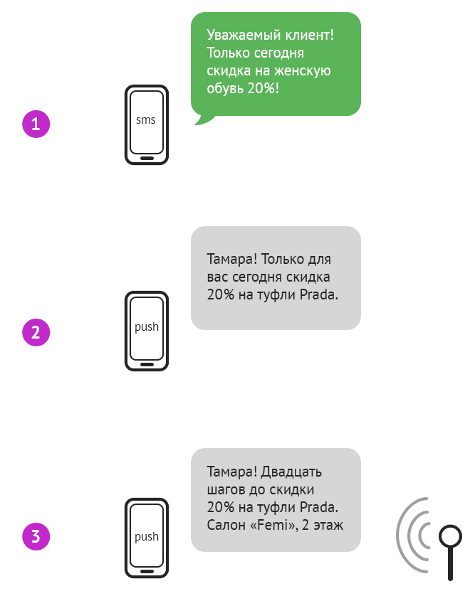1 — ретаргетинг без персонализации по SMS; 2 — ретаргетинг с персонализацией и использованием big data; 3 — ретаргетинг с ibeacon-персонализаций и virtual profile