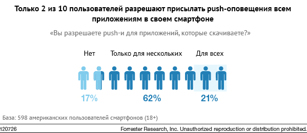У мобильных пользователей есть вентиль от этого канала: в один прекрасный момент они просто могут запретить уведомления. Однако, здесь все не так драматично: исследование Forrester говорит о том, что большая часть пользователей относится к блокировке пушей избирательно: отключая только самые раздражающие или бесполезные.