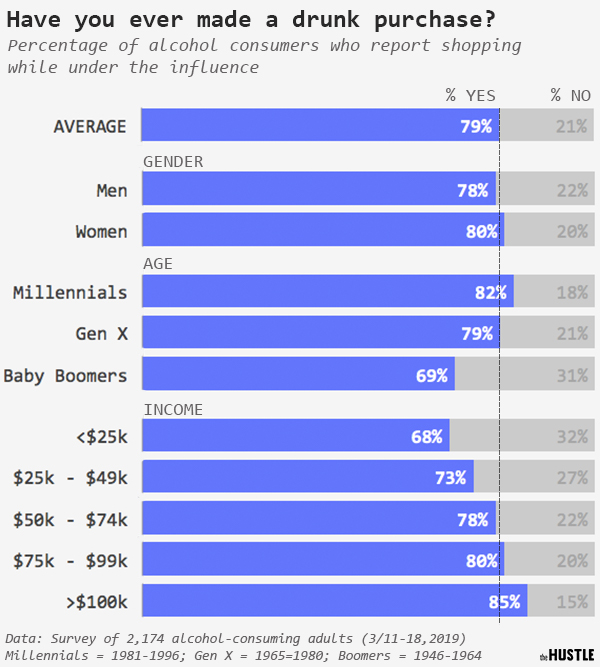 - 82% миллениалов совершали "пьяные покупки". Среди "беби-бумеров" таких покупателей 69%.