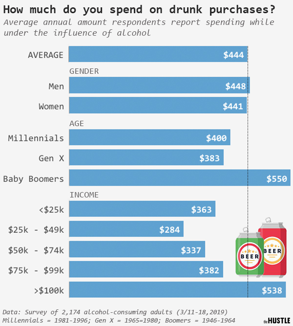 В среднем опрошенные респонденты выкидывают $444 в год на "пьяные покупки". Средний чек установить сложно, так как спонтанные покупки очень разнообразны. Кто-то покупает бумажные копии Ким Чен Ына в натуральную величину, а кто-то - 30-фунтовые мешки с картофелем из Айдахо.