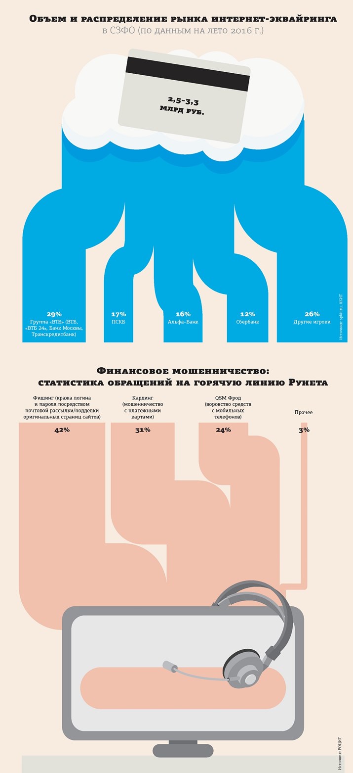 Растущий сегмент интернет-торговли привлекает банки. По данным отчета, на ВТБ, ПСКБ, Альфа–Банк и Северо–Западный банк Сбербанка приходится 74% рынка интернет-эквайринга. При этом банки вынуждены конкурировать с платежными агрегаторами, с которыми работают многие крупные онлайн-ритейлеры.