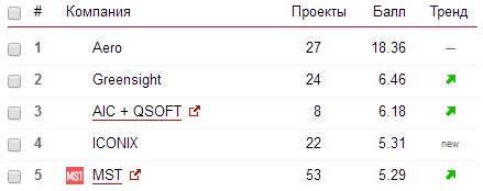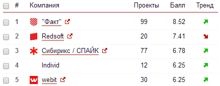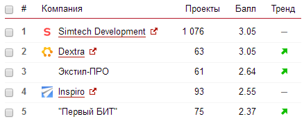 Лидером в нижнем срезе стал разработчик Shop2YOU, первым среди игроков среднего ценового сегмента назвали Simtech Development, в верхнем сегменте ТОП возглавил "Факт", а лучшим среди премиум-разработчиков признан Aero.