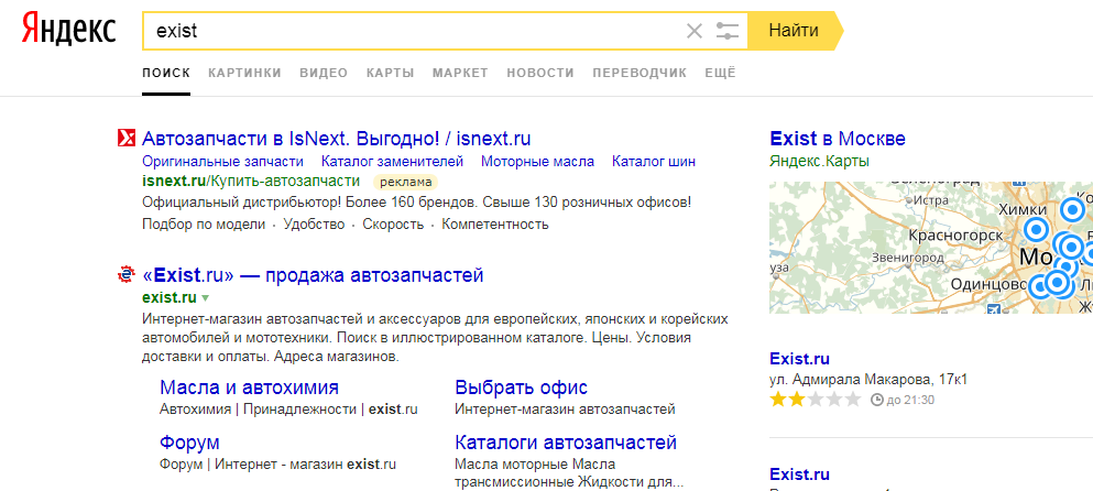Как сообщается на сайте службы, в Управление поступило обращение от ООО "А+А Эксист-Инфо" (обладатель товарного знака "EXIST.RU"). Как говорится в обращении, ООО "Эксист-М", без согласия заявителя при предложении и реализации услуг по продаже транспортных средств и автомобильных деталей, использует товарный знак "EXIST.RU" и размещает недостоверную информацию, "вводя потребителей в заблуждение".