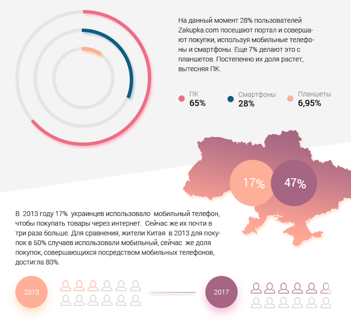 Большинство пользователей сервиса посещают сайт Zakupka.com, используя декстопные устройства. Однако доля мобильных устройств растет, постепенно вытесняя ПК. По данным аналитиков, в 2013 году всего 17% украинцев покупали в интернете через смартфон, а в прошлом году – 47%.