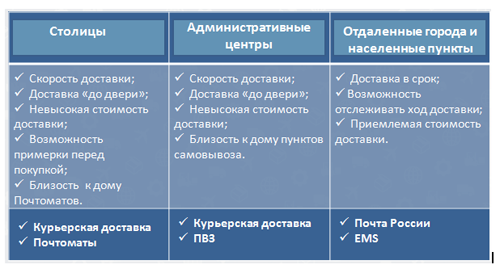 - Особое внимание к сервисам в столицах. Все, что рынок придумал, должно быть в арсенале: плавающие трехчасовые интервалы, оплата наличными и банковскими картами, маркетинг при вручении, выезд курьера к клиенту за возвратным заказом, возможность прислать курьера к получателю с исправным товаром в замен сломанному и т.д.
