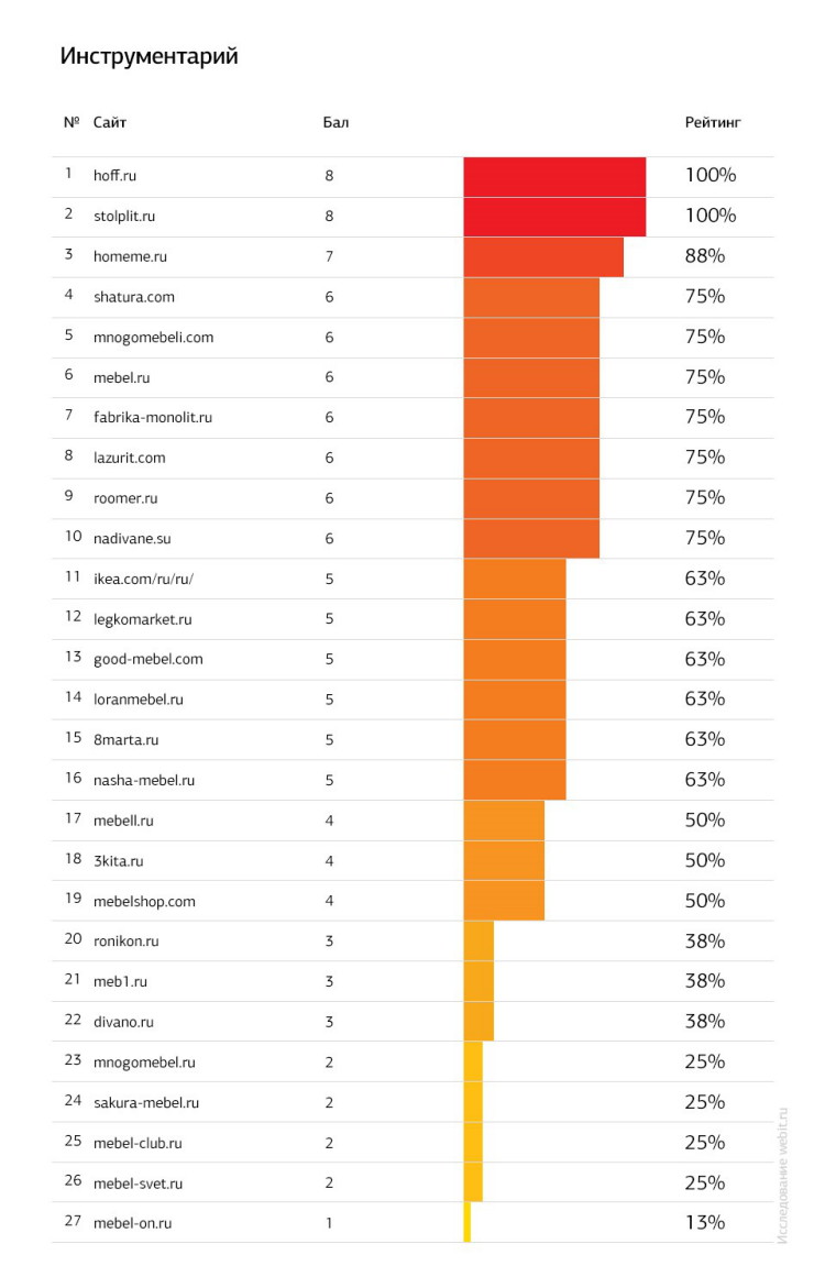 По итогам исследования победителями оказались следующие компании. Случайных новичков здесь нет. Первое место занял магазин Hoff, второе – «Столплит», третье разделили «Шатура» и IKEA.