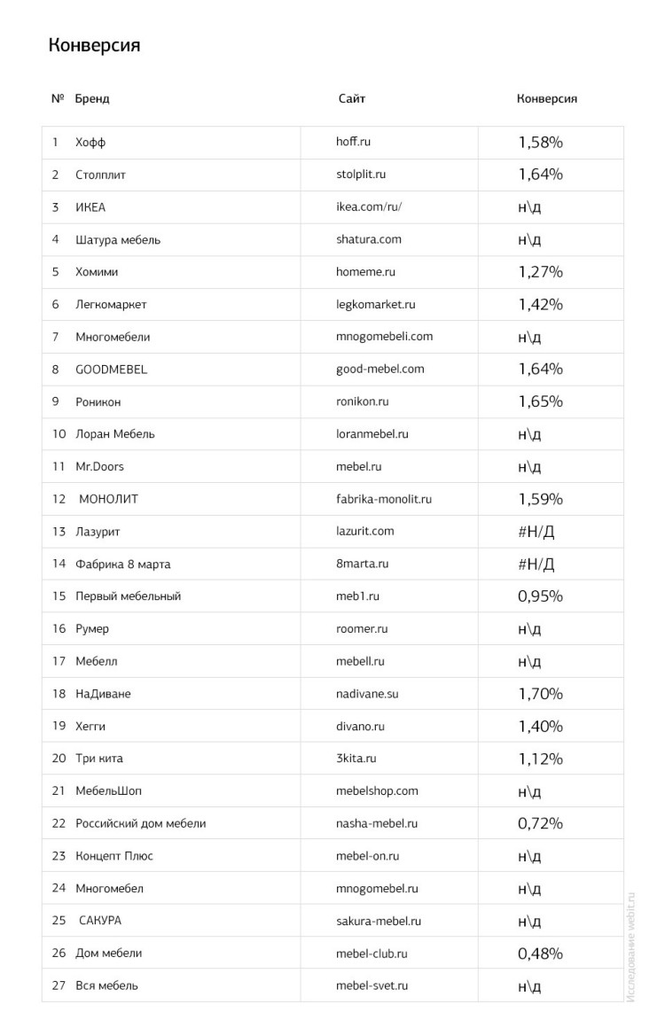 Кроме того, исследуемые показатели позволили косвенно судить о конверсии 13 сайтов, которую мы вынесли в отдельный рейтинг.