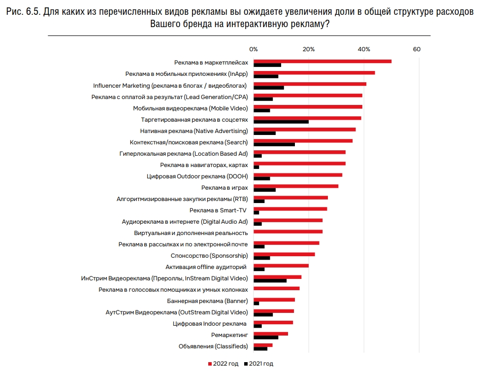 Если в 2019–2021 годах респонденты стабильно говорили о росте доли в бюджете преимущественно расходов на таргетированную, контекстную и InStream-видеорекламу, то теперь компании ожидают самого быстрого роста в совершенно других категориях: реклама на маркетплейсах, в мобильных приложениях, Influncer marketing.