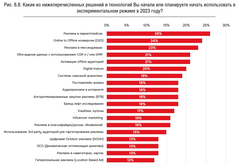 В среднем в 2022 году компании тратили около 25% своего рекламного бюджета на эксперименты в сфере digital. Помимо рекламы на маркетплейсах, заметен интерес компаний к инструментам на стыке онлайна и оффлайна, таким как Online to Offline конверсия (24% респондентов), активация Offline аудиторий (21%), Digital Instore (20%).