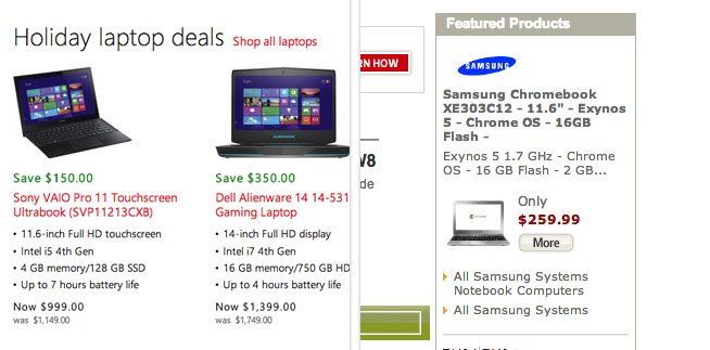 Microsoft (слева) предлагает пользователям быстрый способ просмотра других «интернет-магазинов ноутбуков». CDW (справа) связывает категории товаров каждого показанного продукта.