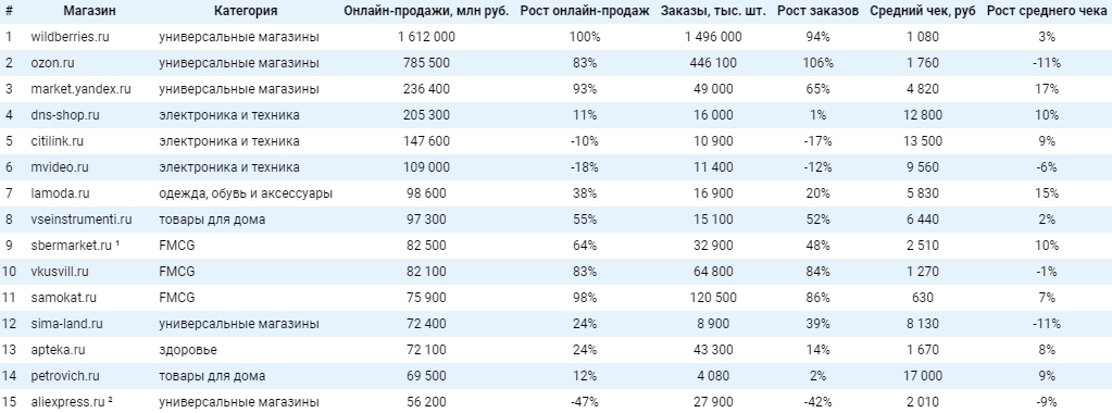Главным аутсайдером рейтинга стал Aliexpress, который оказался на 15 месте, с просадкой за год на 47%. Из интересных новичков - ритейлер "Ашан", который вырос в онлайне на 179%. Компания продала товаров на 4 100 млн рублей и вышла на 97 место в рейтинге.