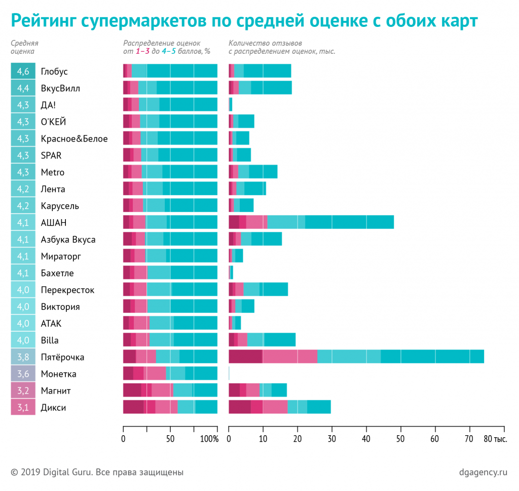 Эксперты агентства по управлению онлайн-репутацией Digital Guru проанализировали 361 тысячу отзывов, которые москвичи оставляли на Яндекс.Картах и Google Maps в 2017-2019 годах. Цель исследования - узнать, как большие розничные сети представлены на онлайн-картах, как менялся объем информации о них на картах и как они работают с отзывами.