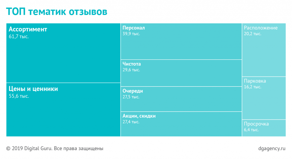 Агентство проанализировало отзывы о магазинах 19 сетей: это "Пятерочка", "Ашан", "Дикси", Billa, "ВкусВилл", Globus, "Перекресток", "Магнит", "Азбука Вкуса", Metro, "Лента", "Виктория", "О'КЕЙ", "Карусель", "Красное & Белое", SPAR, "Атак", "Бахетле" и "ДА!". Активнее всего пользователи отзываются о "Пятерочке" (74 тысячи отзывов), "Ашане" (около 48 тысяч) и "Дикси" (29,6 тысяч).