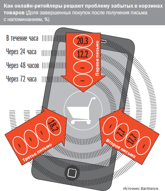 Исследователи портала Barilliance заявили, что первое письмо с напоминанием нужно отправлять в течение часа после того, как пользователь оставил корзину. Это поможет добиться завершения 20% покупок. Через 24 часа доля оформленных после напоминания заказов снижается до 12,2%.