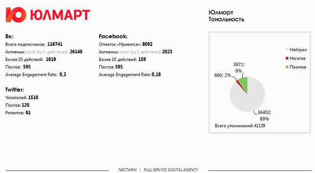 «Юлмарт» очень активен в социальных медиа и имеет наибольшее число официальных аккаунтов. Наблюдается высокая вовлеченность аудитории: существенная часть пользователей («ВКонтакте» — 22%, Facebook— 25%) так или иначе взаимодействовали с контентом (комментарии/лайки/репосты/ретвиты). Во всех аккаунтах много контента, прямо не связанного с деятельностью магазина: новости, статьи, иллюстрации.