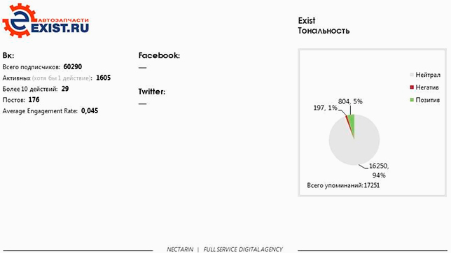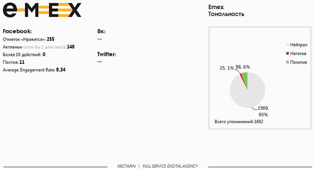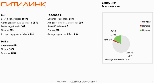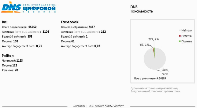 Магазин имеет наибольшее количество позитивных отзывов среди всех участников исследования: около 17%. Очень активны в Twitter, высокий уровень взаимодействия с аудиторией. Публикации в Facebook и «ВКонтакте» идентичны.