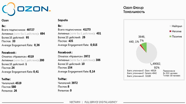 Ozon активен преимущественно в Twitter, который использует как средство обратной связи с клиентами. Sapato уделяет больше внимания «ВКонтакте». Ozon использует открытую стену, куда клиенты отправляют вопросы и жалобы. Как инструменты вовлечения используют конкурсы и различные интерактивы.
